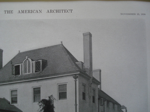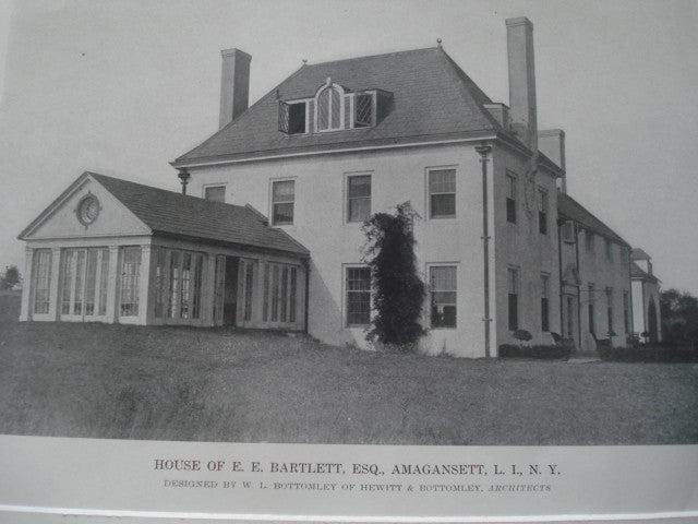 A Beautifully Detailed, Original Lithograph of the House of E.E. Bartlett,ESQ, Amagansett, L.I., New York, View Showing Sun Porch. EARLY PHOTOGRAPH. Messrs. W.L. Bottomley of Hewitt & Bottomley, Architect(s.) From the American Architect, November 15, 1916. This picture is extremely hard to find. The American Architect had a very small circulation during this time and these original lithographs only appeared in a very limited number of issues that were distributed to a few prominent architects. It measures 8.5 by 11.75 inches. Has a mat border and foam core backing (not attached to the picture). The whole picture measures approximately 12 by 16 inches (with border). Extraordinary detail in this early photographic print. Shrink wrapped. NOTE: We have another exterior view from opposite side of house.