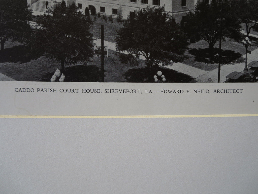 A Beautifully Detailed, Original Lithograph of the Caddo Parish Court House, Shreveport, Louisiana. EARLY PHOTOGRAPH. Edward F. Neild, Architect(s.) From the American Architect, August 5, 1929. (Additional photograph of main entrance on back side.)