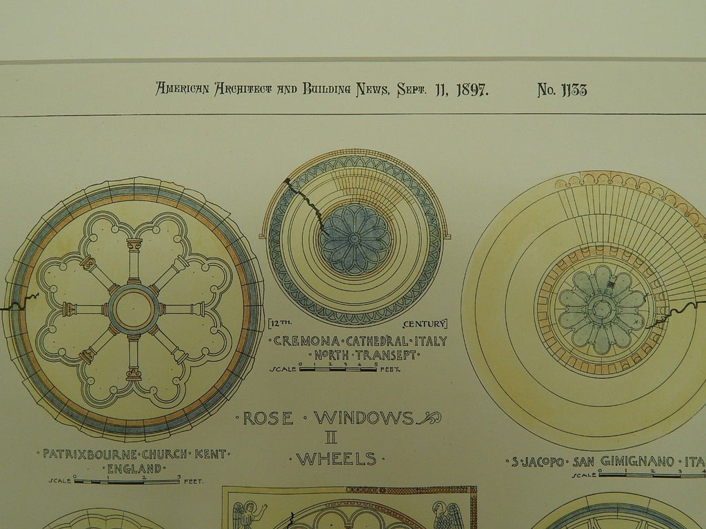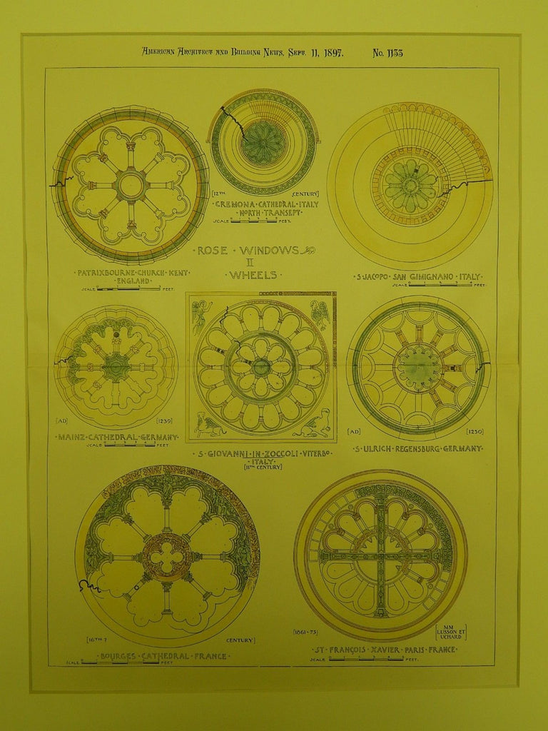 A Beautifully Detailed, Original Plan of Various European Rose Windows including the Bourges Cathedral in Bourges, France.  HAND-COLORED.  Various, Architects.  From the American Architect and Building News, September 11, 1897.