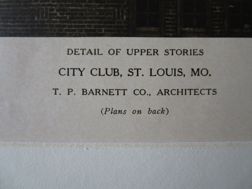 A Beautifully Detailed, Original Lithograph of the City Club, St. Louis, Missouri. EARLY PHOTOGRAPH. T. P. Barnett Co., Architect(s.) Architectural Plan on the back side of photo. From the American Architect, September 10, 1924.