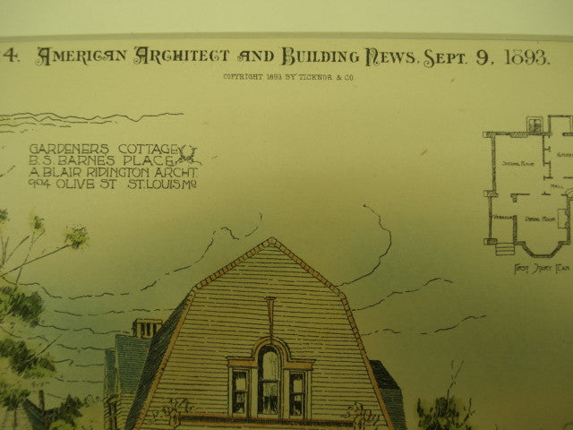 A. Blair Ridington, architect(s). From the American Architect and Building News, September 9, 1893. 13 by 8.75 inches. VG+ condition with light browning along the edges and some light crinkling.