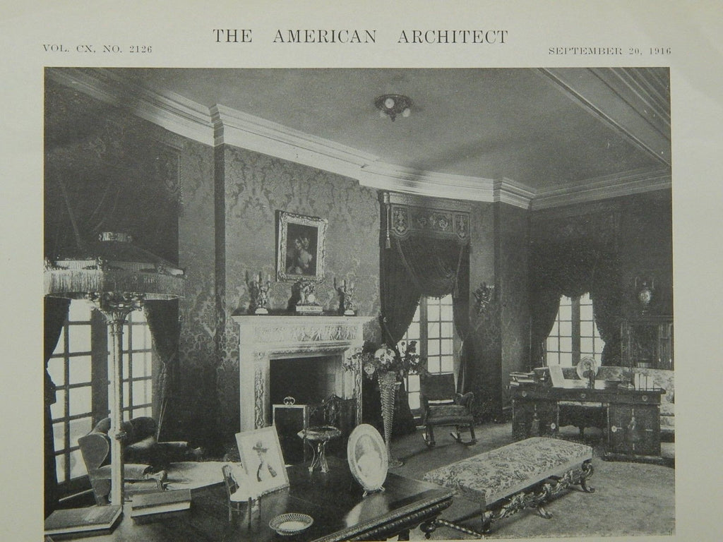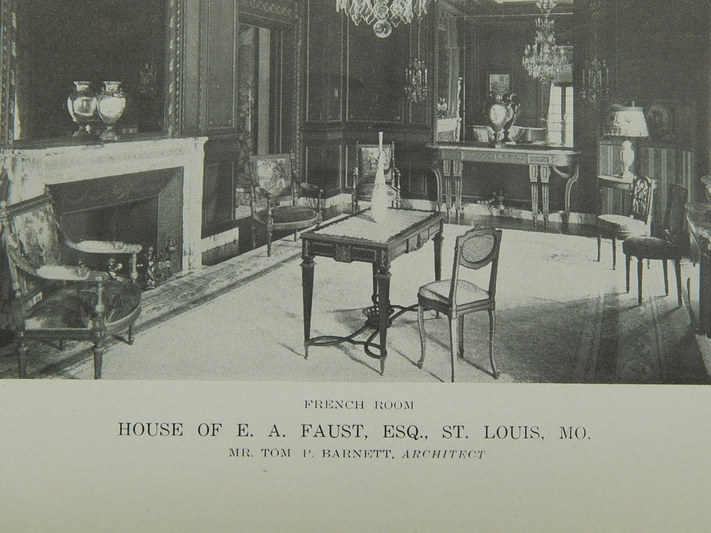 A Beautifully Detailed, Original Lithograph of the Morning Room and French Room in the House of E. A. Fuast, Esq. in St. Louis, Missouri. EARLY PHOTOGRAPH. Tom P. Barnett, Architect. From the American Architect and Building News, September 20, 1916.