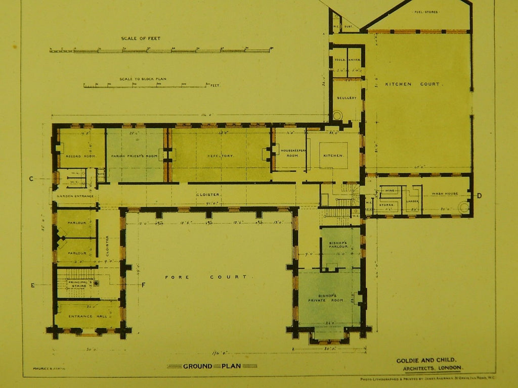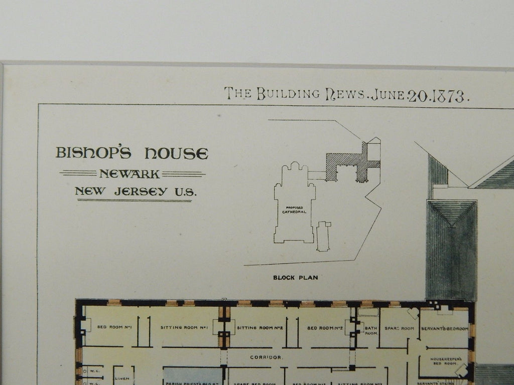 A Beautifully Detailed, Original Plan of the Bishop's House in Newark, New Jersey. HAND-COLORED. Goldie and Child, Architects. From the American Architect and Building News, June 20, 1873.
