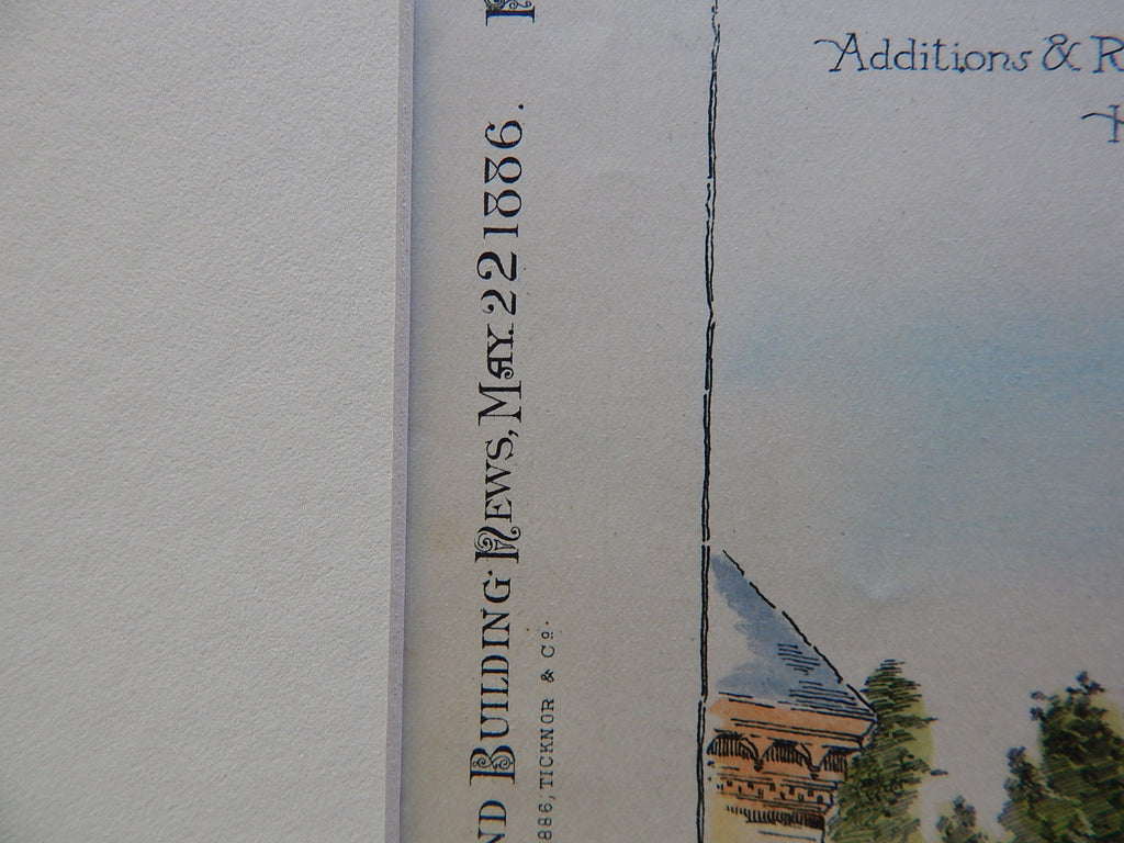 This picture is extremely hard to find, as the American Architect and Building News not only had a very small circulation during that time, but very few were actually preserved or colored as this has been. It measures 7 by 5 inches. Has a mat border and foam core backing (not attached to the picture). The whole plan measures approximately 11 by 9 inches (with mat border). Finely detailed and beautifully hand-colored. Shrink wrapped.