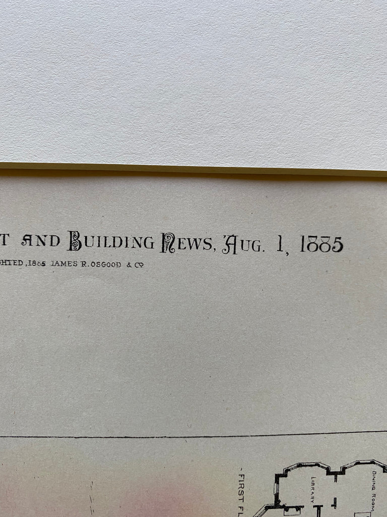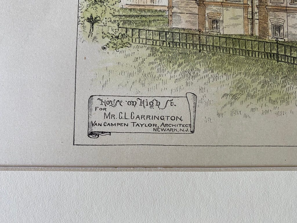 Beautifully Detailed, Original Plan of the House for C L Carrington, High Street, Newark, New Jersey. HAND COLORED ORIGINAL Van Campen Taylor, Architect(s). From the American Architect and Building News, August 1, 1885.