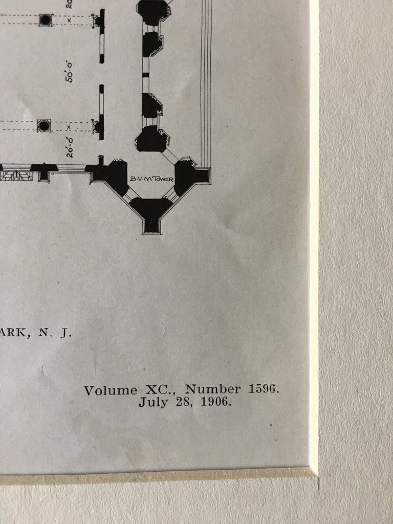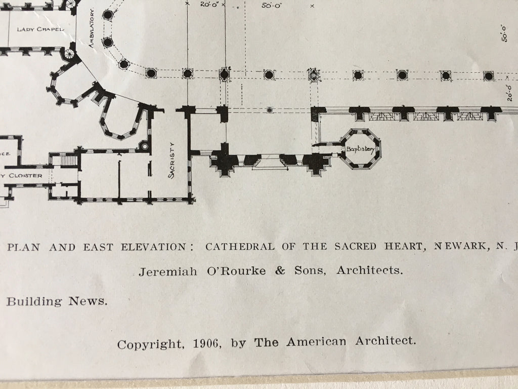 A Beautifully Detailed, Original Plan of the East Elevation, Cathedral of the Sacred Heart, Newark, New Jersey. HAND COLORED Jeremiah O'Rourke & Sons, Architect(s). From the American Architect & Building News, July 28, 1906.
