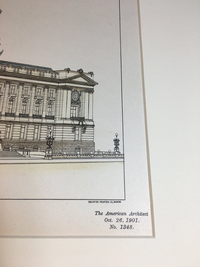 A Beautifully Detailed, Original Plan of a Competitive Design for the City Hall of Newark, New Jersey. HAND COLORED C L Roos, Architect(s). From the American Architect and Building News, October 26, 1901.