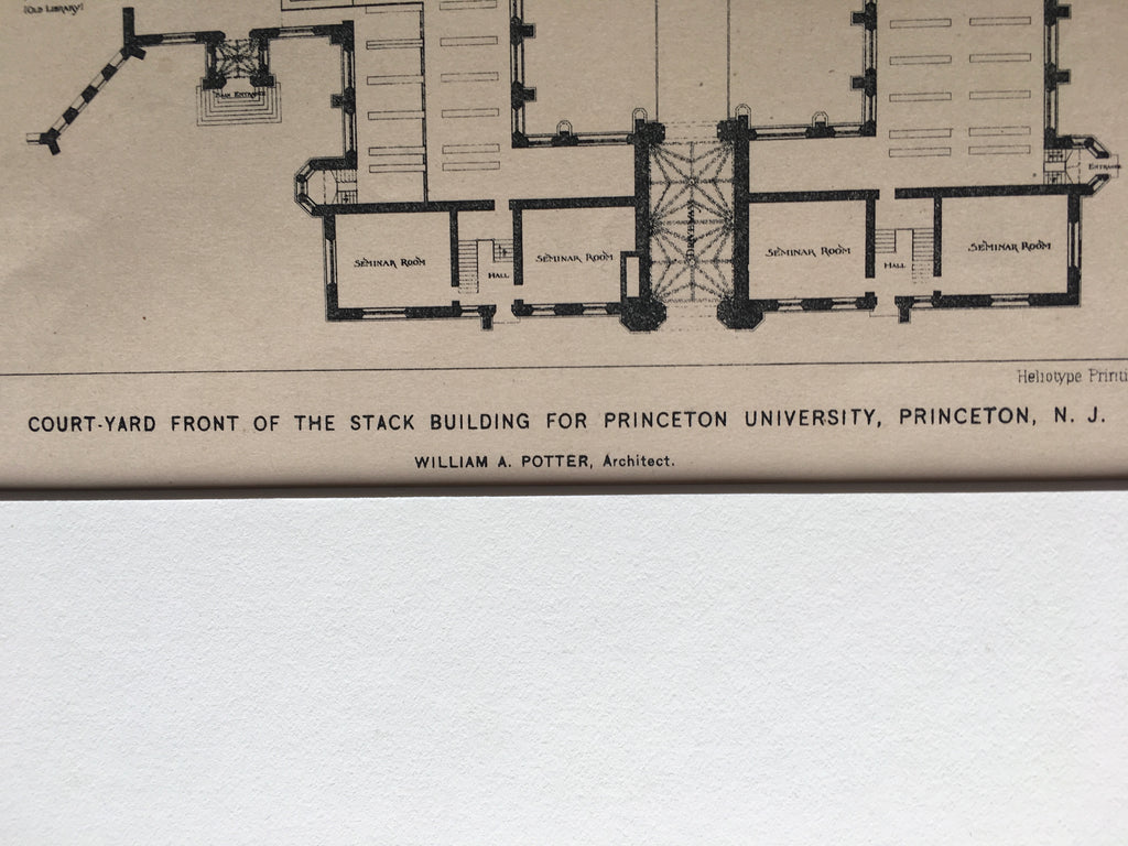 A Beautifully Detailed, Original Plan of the Courtyard Front of the Stack Building for Princeton University, Princeton, New Jersey. HAND-COLORED. William A Potter, Architect(s). From the American Architect and Building News, November 14, 1896.
