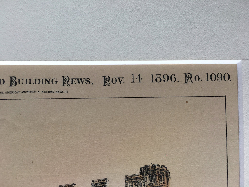 This picture is extremely hard to find, as the American Architect and Building News not only had a very small circulation during that time, but very few were actually preserved or colored as this has been. It measures approximately 12 by 8 inches and has a mat border and foam core backing (not attached to the picture). The whole plan measures approximately 16 by 12 inches (with mat border). Finely detailed and beautifully hand colored. Shrink wrapped.
