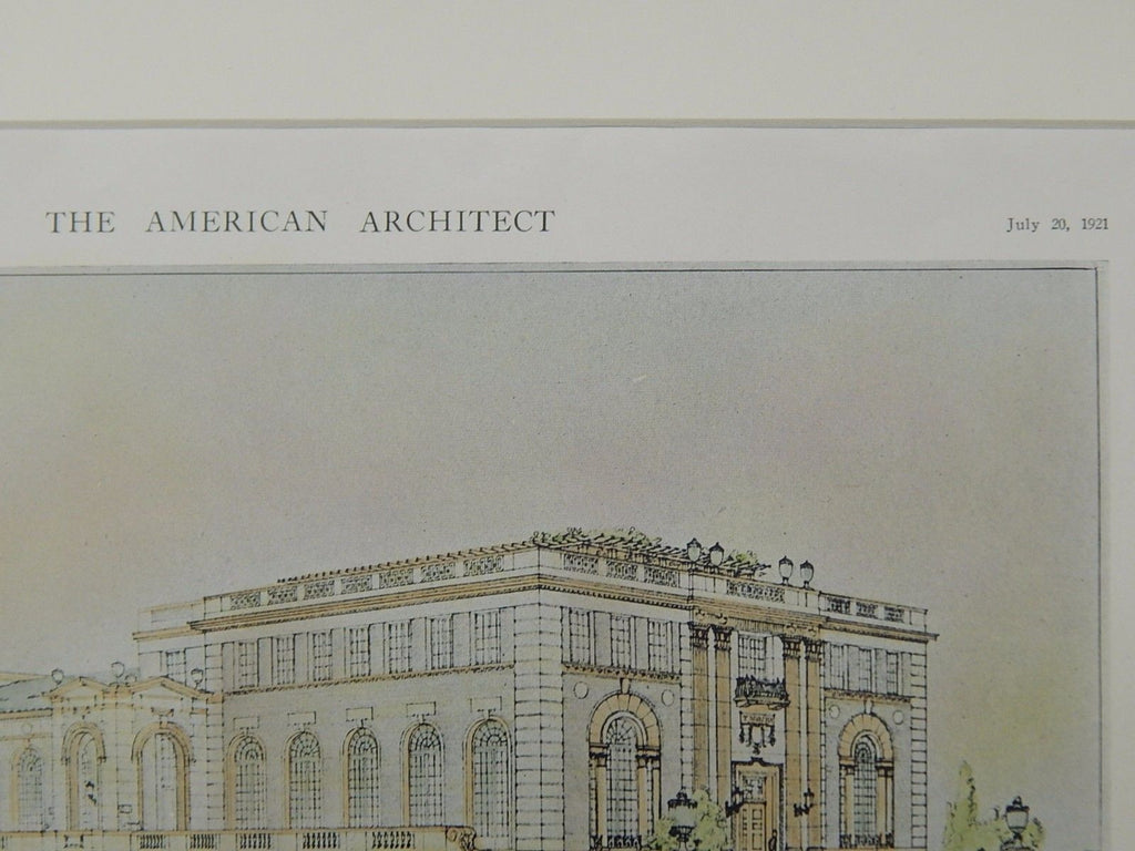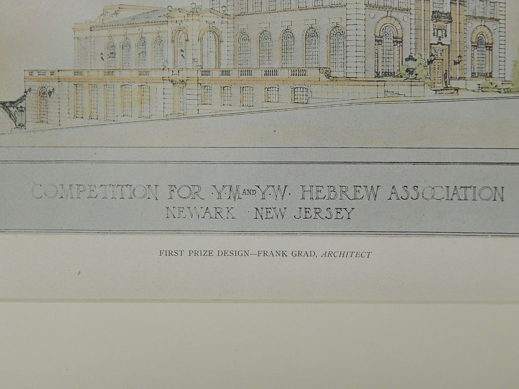 A Beautifully Detailed, Original Plan of the First Prize Design for the Young Men's and Young Women's Hebrew Association Building in Newark, New Jersey. HAND-COLORED. Frank Grad, Architect. From the American Architect and Building News, July 20, 1921.