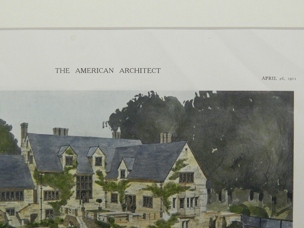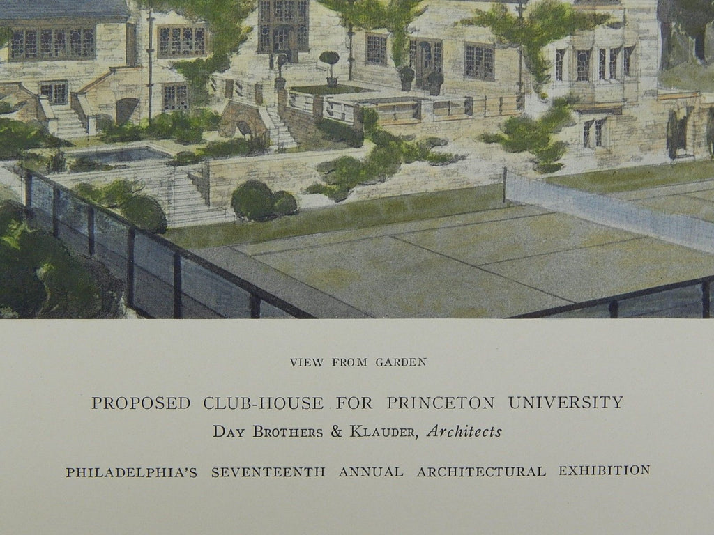 A Beautifully Detailed, Original Plan of the View from the Garden of the Proposed Club-House for Princeton University in Princeton, New Jersey. HAND-COLORED. Day Brothers & Klauder, Architects. From the American Architect and Building News, April 26, 1911.