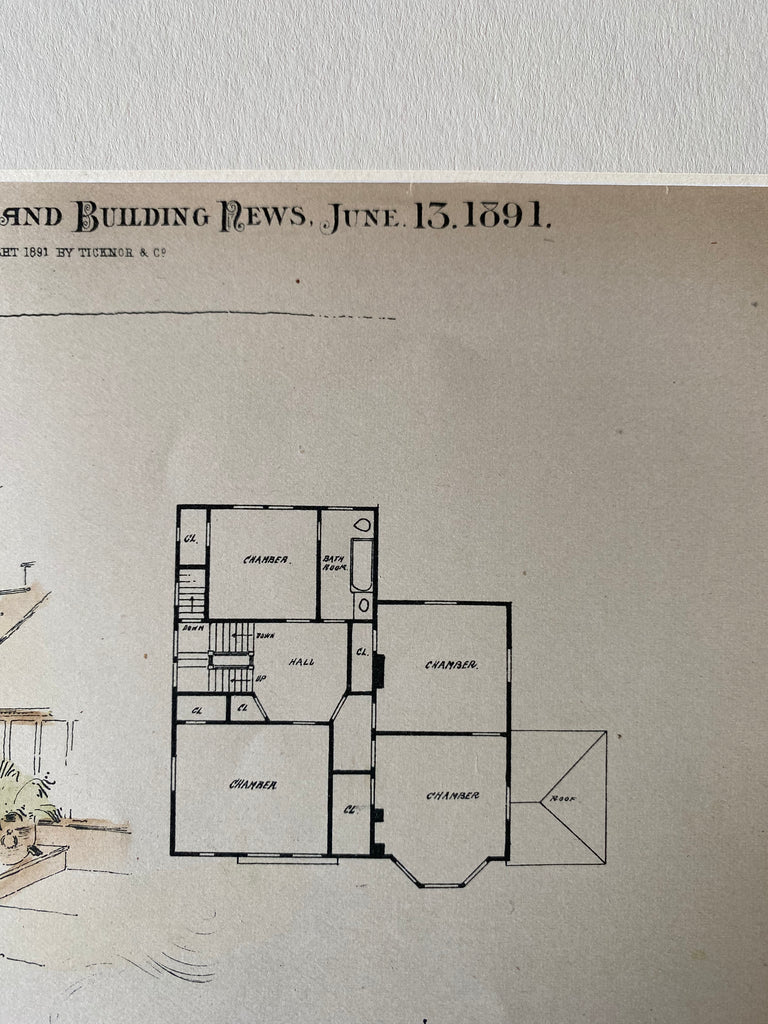 A Beautifully Detailed, Original Plan of the House at Ridgefield, New Jersey. HAND COLORED F W Beall, Architect(s). From the American Architect and Building News, June 13, 1891.