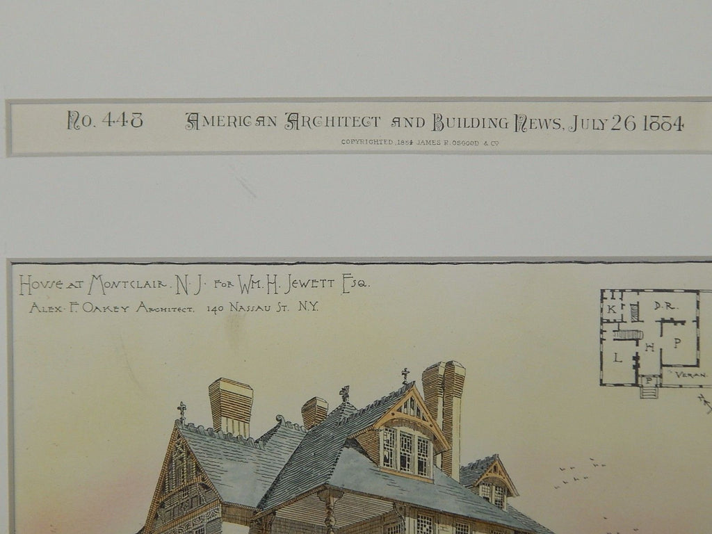 A Beautifully Detailed, Original Plan of the House for Wm. H. Jewett, Esq. in Montclair, New Jersey. HAND-COLORED. Alex F. Oakley, Architect. From the American Architect and Building News, July 26, 1884.