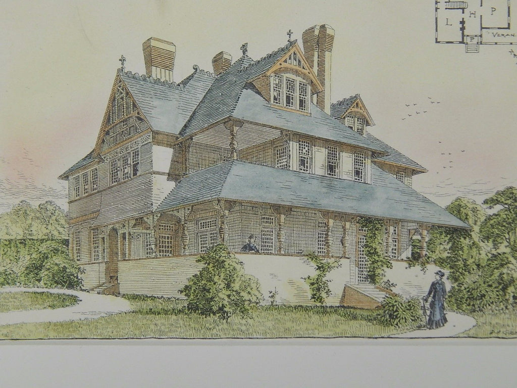 This picture is extremely hard to find, as the American Architect and Building News not only had a very small circulation during that time, but very few were actually preserved or colored as this has been. It measures 8.5 by 6.75 inches. Has a mat border and foam core backing (not attached to the picture). The whole plan measures approximately 11 by 10.5 inches (with mat border). Finely detailed and beautifully hand-colored. Shrink wrapped.