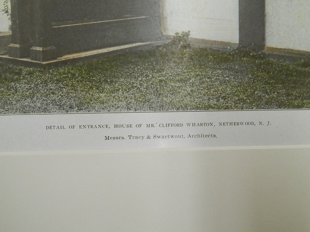 A Beautifully Detailed, Original Photograph of the Detail of the Entrance of the House of Mr. Clifford Wharton in Netherwood, New Jersey. HAND-COLORED. Messrs. Tracy & Swartwout, Architects. From The American Architect and Building News, January 11, 1908.
