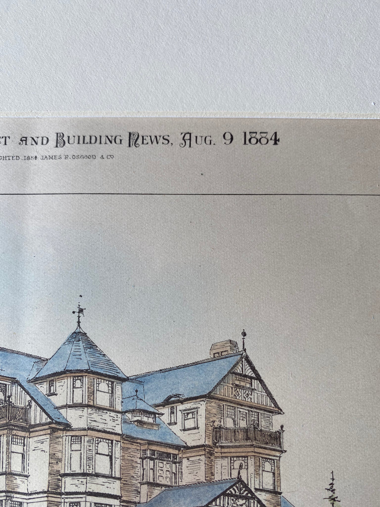 This picture is extremely hard to find, as the American Architect and Building News not only had a very small circulation during that time, but very few were actually preserved or colored as this has been. It measures approximately 8 by 12 inches and has a mat border and foam core backing (not attached to the picture). The whole plan measures approximately 12 by 16 inches (with mat border). Finely detailed and beautifully hand-colored. Shrink wrapped.