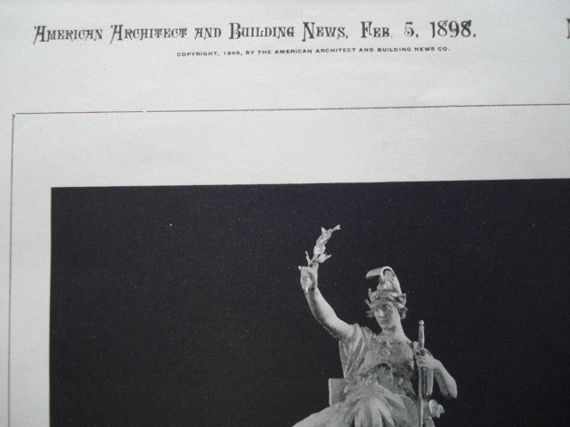 Photogravure. This picture is extremely hard to find. The American Architect and Building News had a very small circulation during this time and these original photogravures only appeared in a very limited number of issues that were distributed to a few prominent architects. It measures 8.75 by 12.25 inches. Has a mat border and foam core backing (not attached to the picture). The whole picture measures approximately 12.75 by 16.25 inches (with border). Extraordinary detail in this early photographic print. Shrink wrapped.