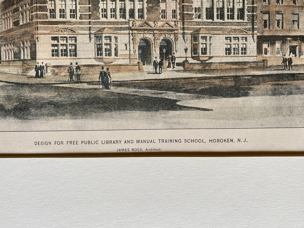 A Beautifully Detailed, Original Plan of the Free Public Library and Manual Training School, Hoboken, New Jersey. HAND COLORED James Ross, Architect(s). From the American Architect and Building News, August 11, 1894.