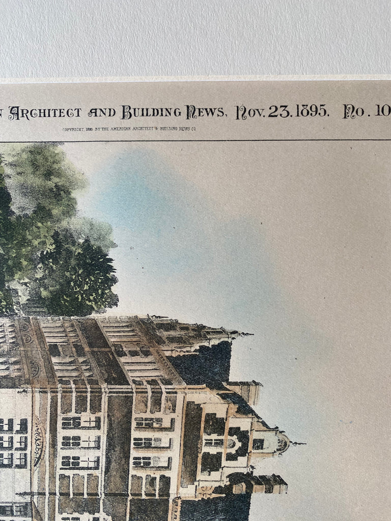 This picture is extremely hard to find, as the American Architect and Building News not only had a very small circulation during that time, but very few were actually preserved or colored as this has been. It measures approximately 12 by 8 inches and has a mat border and foam core backing (not attached to the picture). The whole plan measures approximately 16 by 12 inches (with mat border). Finely detailed and beautifully hand colored. Shrink wrapped.