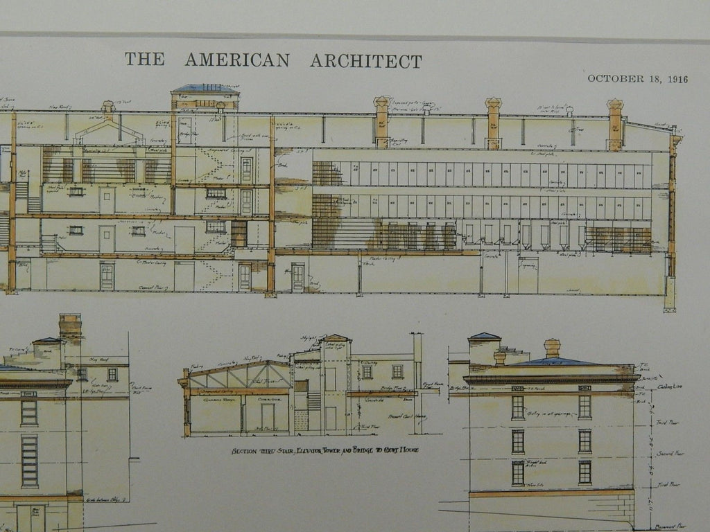 A Beautifully Detailed, Original Plan of the Mercer County Jail in Trenton, New Jersey. HAND-COLORED. William W. Slack, Architect. From the American Architect and Building News, October 18, 1916.