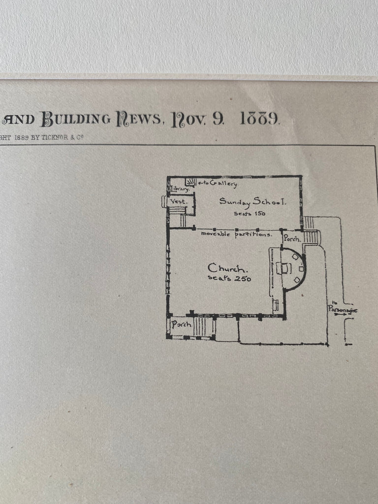 A Beautifully Detailed, Original Plan of the Methodist Episcopal Church at Seabright, New Jersey. HAND COLORED William B Bigelow, Architect(s). From the American Architect & Building News, November 9, 1889.