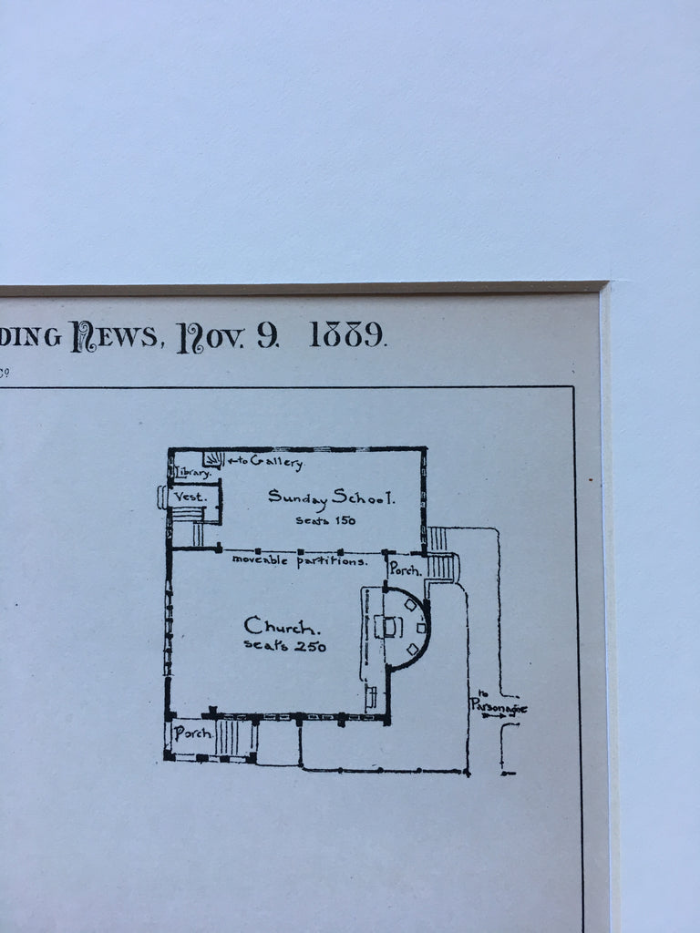 A Beautifully Detailed, Original Plan of the Methodist Episcopal Church, Seabright, New Jersey.   HAND-COLORED.  William B Bigelow, Architect(s).  From the American Architect & Building News, November 9, 1889.