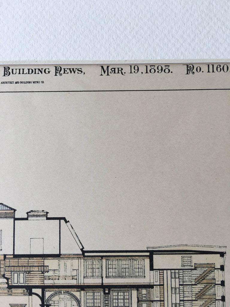 This picture is extremely hard to find, as the Architect not only had a very small circulation during that time, but very few were actually preserved or colored as this has been. It measures 8 by 12 inches and has a mat border and foam core backing (not attached to the picture). The whole plan measures approximately 12 by 16 inches (with mat border). Finely detailed and beautifully hand colored. Shrink wrapped.