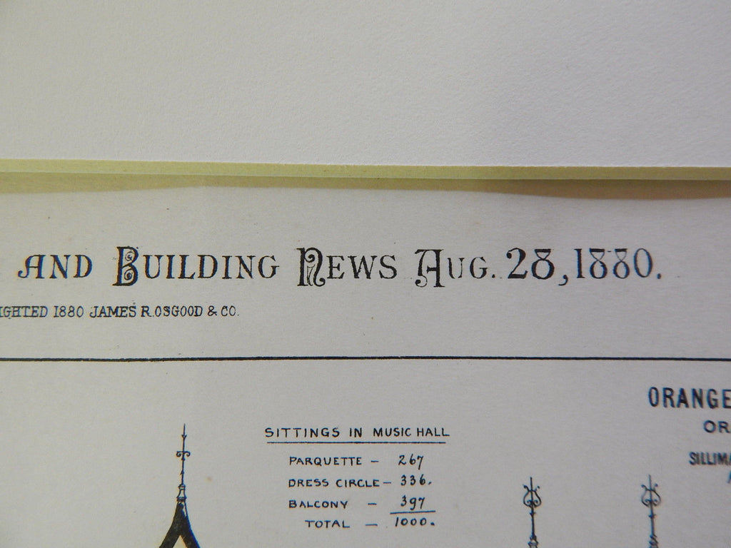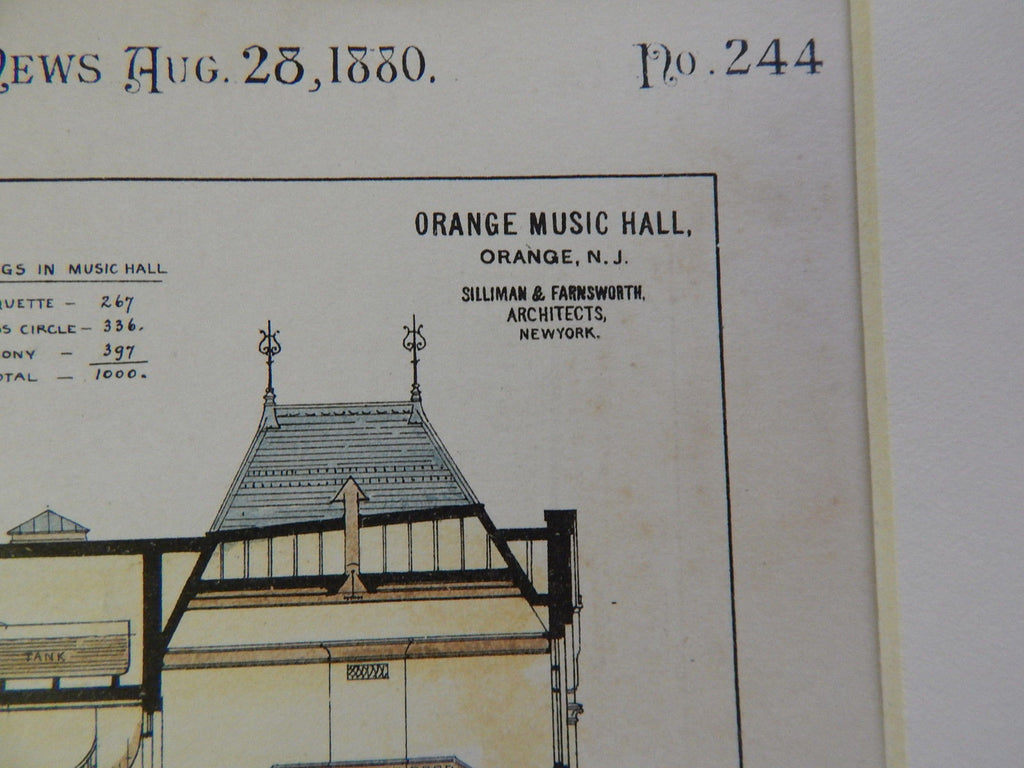 A Beautifully Detailed, Original Plan of the Orange Music Hall, Orange, New Jersey. HAND-COLORED. Silliman & Farnsworth, Architect(s). From the American Architect and Building News. August 28, 1880.