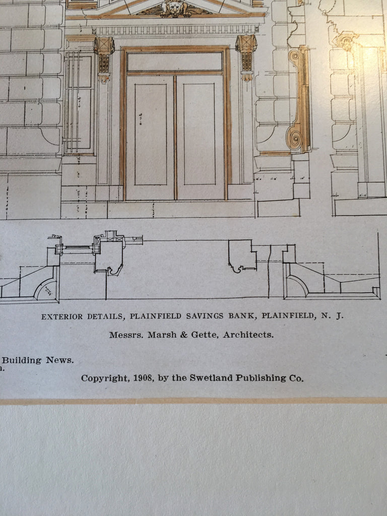 A Beautifully Detailed, Original Plan of the Exterior Details of the Plainfield Savings Bank, Plainfield, New Jersey. HAND COLORED Marsh & Gette, Architect(s). From the American Architect and Building News, April 29, 1908.