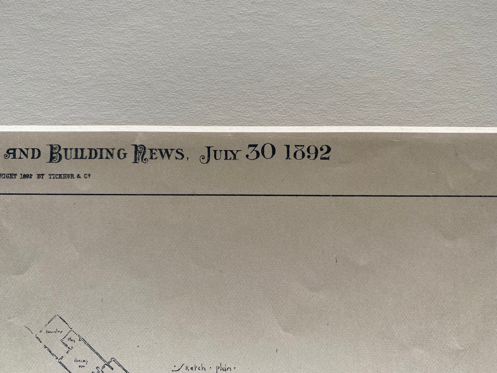 This picture is extremely hard to find, as the Architect not only had a very small circulation during that time, but very few were actually preserved or colored as this has been. It measures approximately 12 by 8 inches. It has a mat border and foam core backing (not attached to the picture). The whole plan measures approximately 16 by 12 inches (with mat border). Finely detailed and beautifully hand-colored. Shrink wrapped.