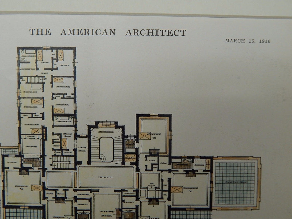 A Beautifully Detailed, Original Plan of Raymere, the House of Mrs. Regina Rothschild in Deal, New Jersey. HAND-COLORED. Albert S. Gottlieb, Architect. From the American Architect and Building News, March 15, 1916.