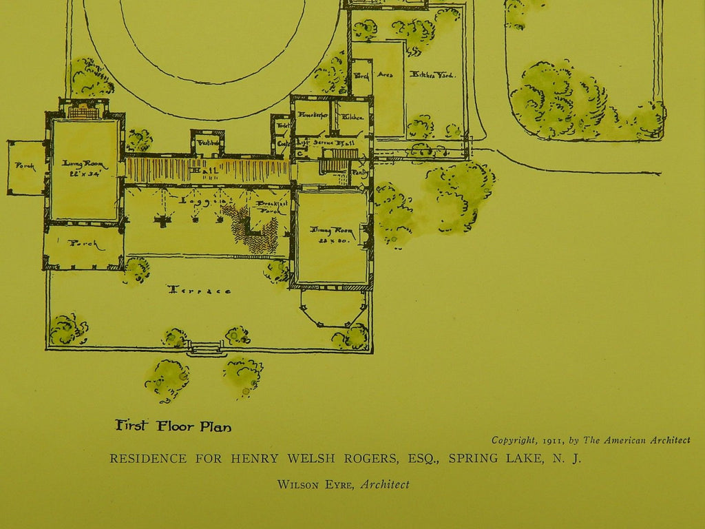 A Beautifully Detailed, Original Plan of the Residence for Henry Welsh Rogers, Esq. in Spring Lake, New Jersey. HAND-COLORED. Wilson Eyre, Architect. From the American Architect and Building News, April 14, 1911.
