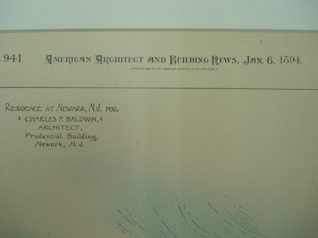 Charles P. Baldwin, architect(s). From the American Architect and Building News, January 6, 1894. 13 by 8.5 inches. VG+ condition.