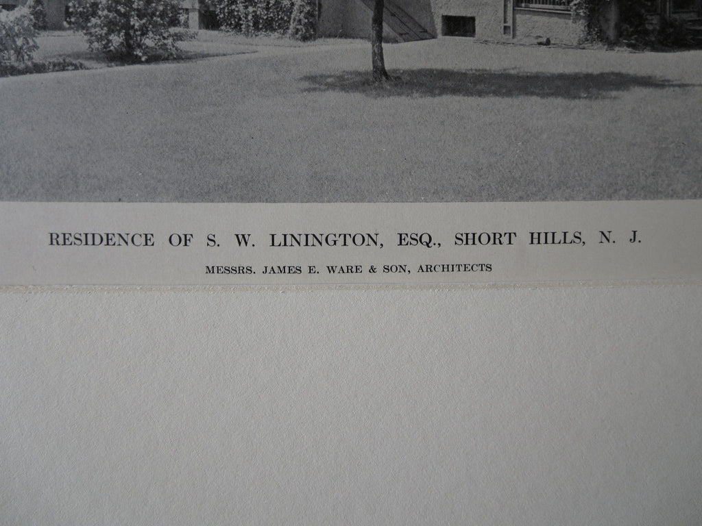 A Beautifully Detailed, Original Lithograph of the Residence of S. W. Linington, Esq., Short Hills, New Jersey. EARLY PHOTOGRAPH. James E. Ware & Son, Architect(s.) From the American Architect, November 15, 1911.