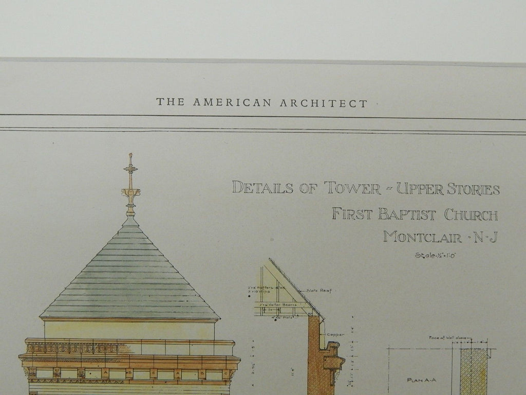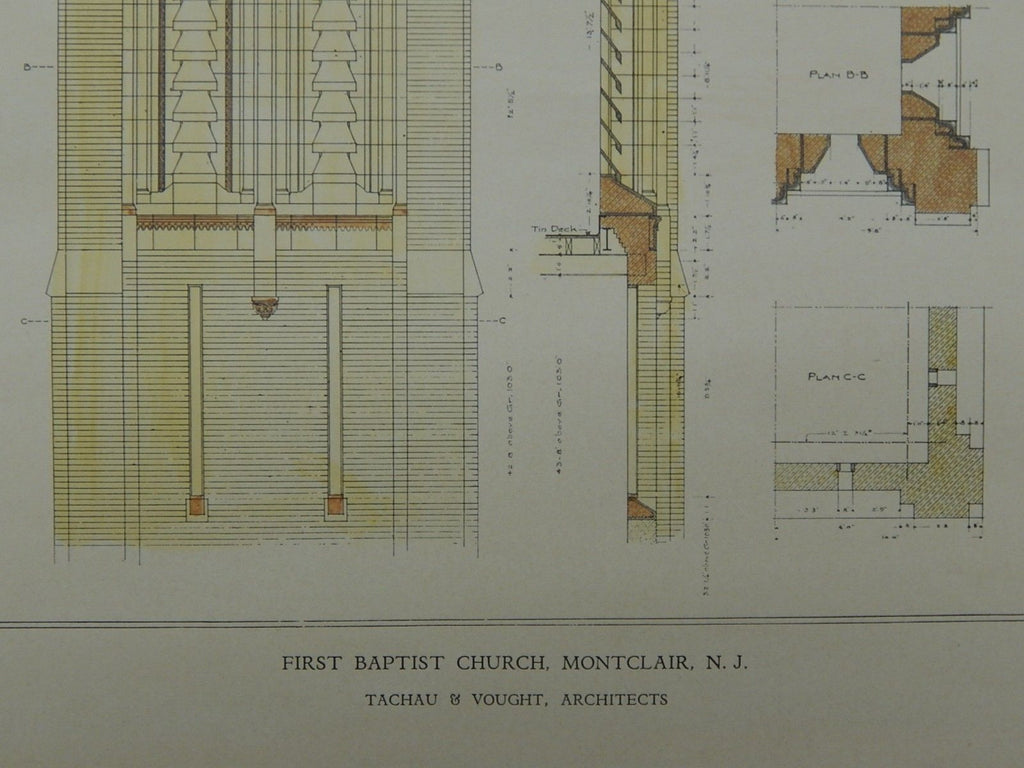 A Beautifully Detailed, Original Plan of the Details of the Tower and Upper Stories and the First Baptist Church in Montclair, New Jersey. HAND-COLORED. Tachau & Vought, Architects. From the American Architect and Building News, April 5, 1926.