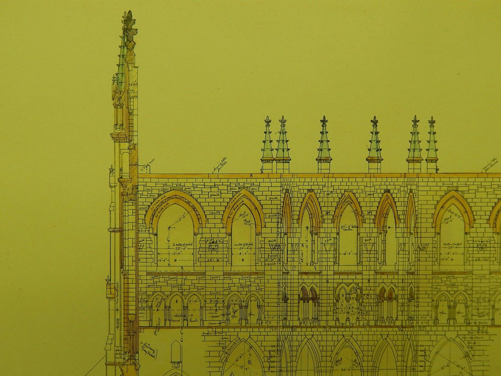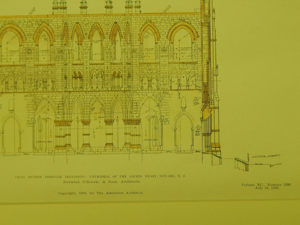 A Beautifully Detailed, Original Plan of the Cross Section through Transepts in the Cathedral of the Sacred Heart in Newark, New Jersey.  HAND-COLORED.  Jeremiah O'Rourke & Sons, Architects.  From the American Architect and Building News, July 28, 1906.