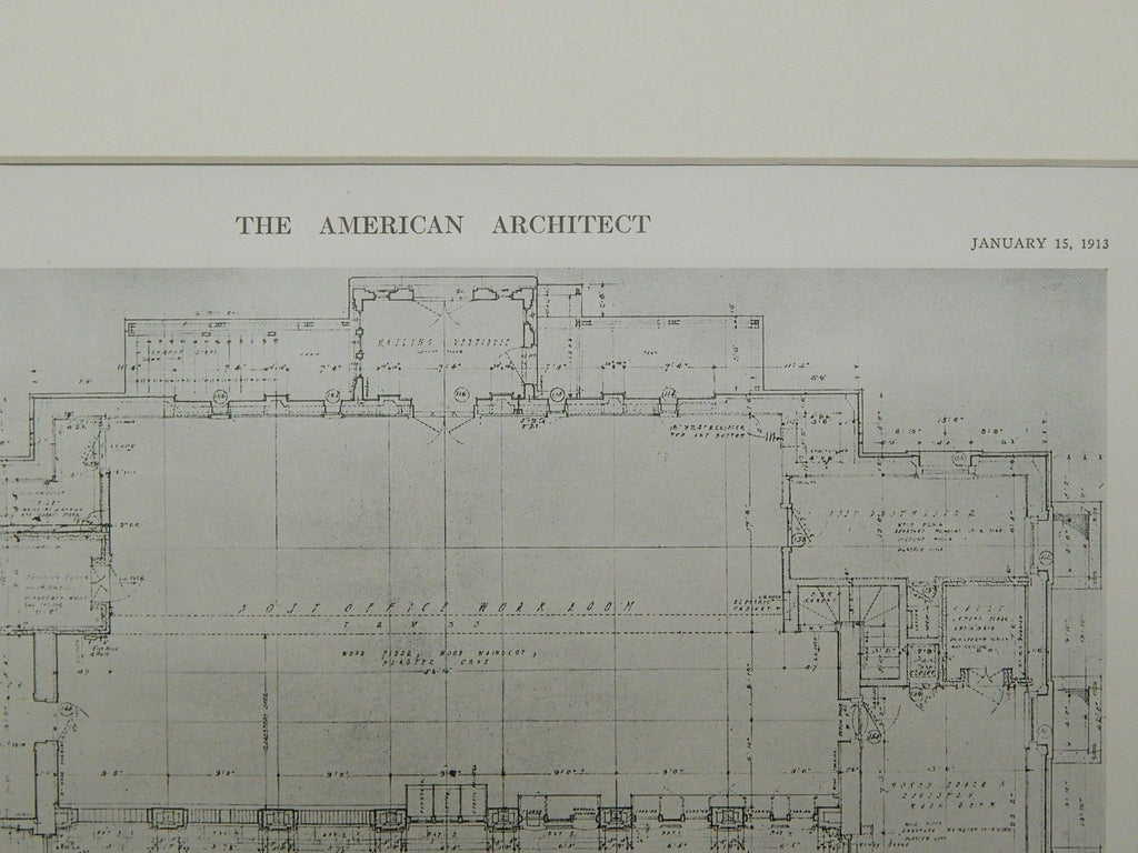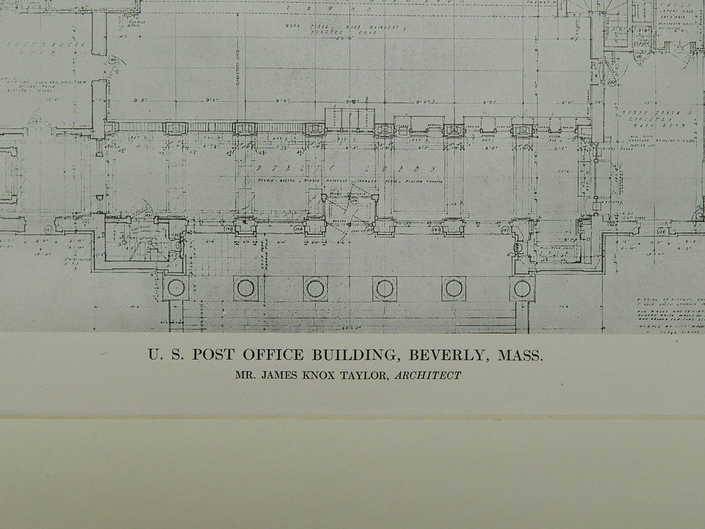 A Beautifully Detailed, Original Plan of the United States Post Office Building in Beverly, Massachusetts. James Knox Taylor, Architect. From the American Architect and Building News, January 15, 1913.