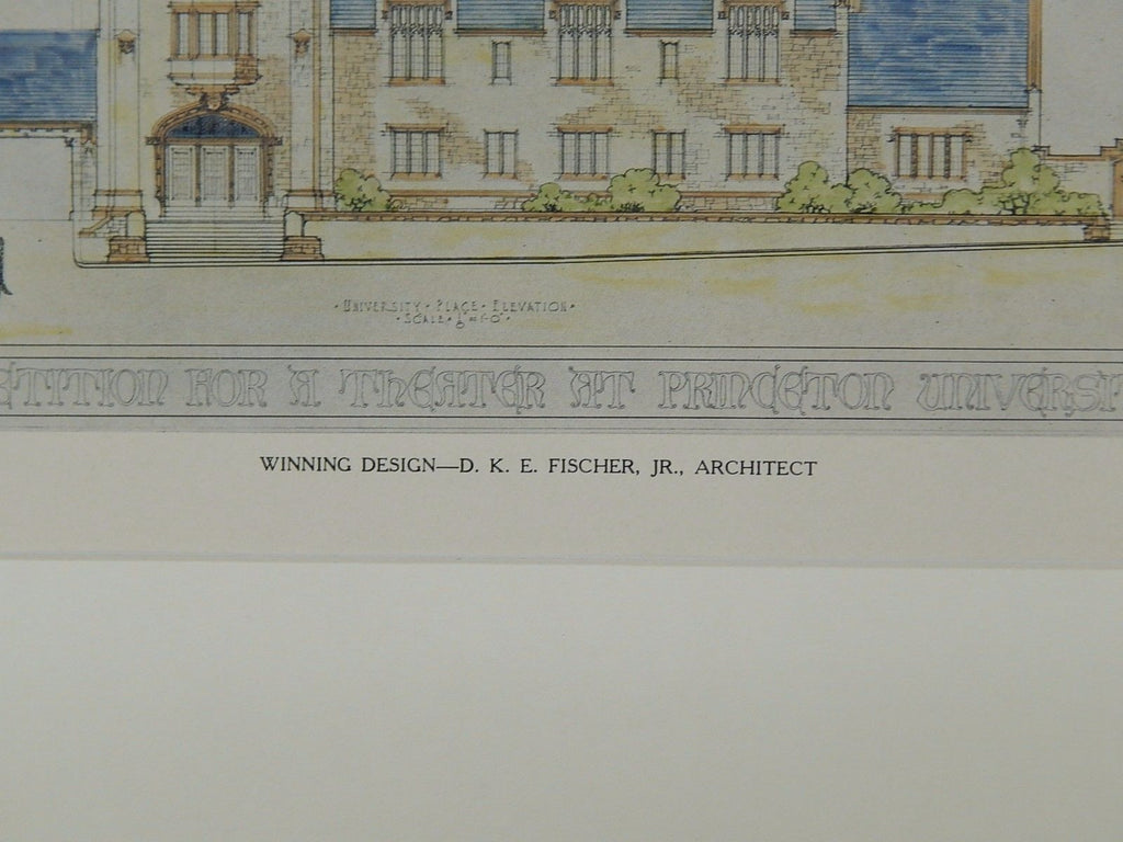 A Beautifully Detailed, Original Plan of the Winning Design for a Theater at Princeton University in Princeton, New Jersey. HAND-COLORED. D. K. E. Fischer, Jr., Architect. From the American Architect and Building News, September, 1924.