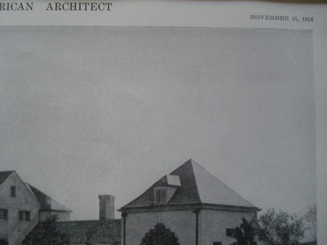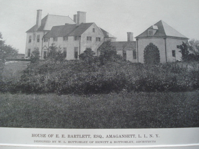 A Beautifully Detailed, Original Lithograph of the House of E.E. Bartlett,ESQ, Amagansett, L.I., New York, No. 2 View. EARLY PHOTOGRAPH. Messrs. W.L. Bottomley of Hewitt & Bottomley, Architect(s.) From the American Architect, November 15, 1916. This picture is extremely hard to find. The American Architect had a very small circulation during this time and these original lithographs only appeared in a very limited number of issues that were distributed to a few prominent architects. It measures 8.5 by 11.75 inches. Has a mat border and foam core backing (not attached to the picture). The whole picture measures approximately 12 by 16 inches (with border). Extraordinary detail in this early photographic print. Shrink wrapped. NOTE: We have another exterior view from opposite side of house.