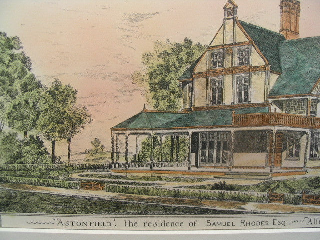 A Beautifully Detailed, Original Plan of the "Astonsfield," the Residence of Samuel Rhodes in New York, New York. This picture is extremely hard to find, as the American Architect and Building News not only had a very small circulation during that time, but very few were actually preserved or colored as this has been. It measures 12.75 by 8.75 inches. Has a mat border and foam core backing (not attached to the picture). The whole picture measures 15 by 11.25 inches (with border). Finely detailed and beautifully hand-colored. Shrink wrapped.