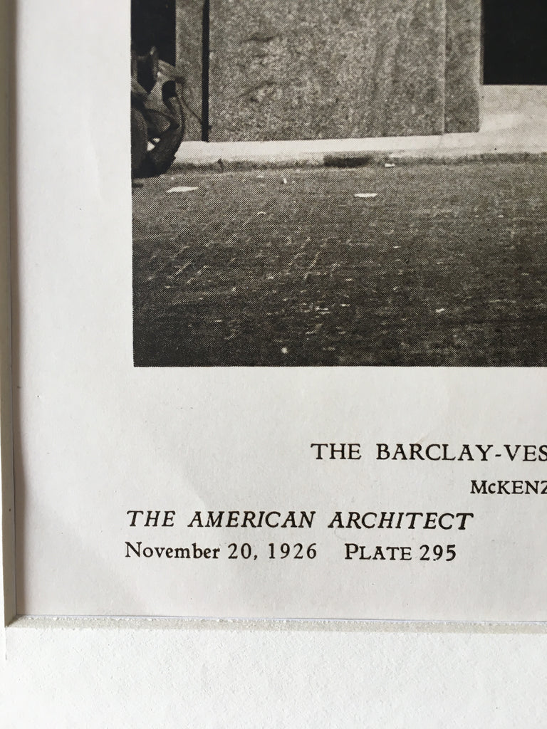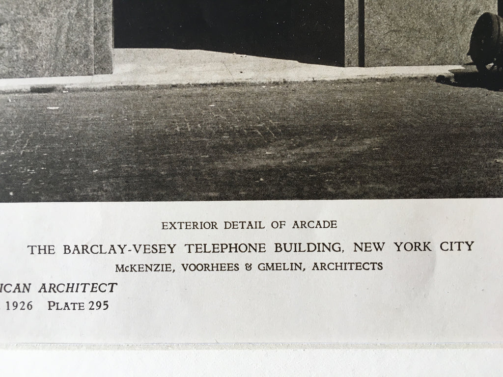 A Beautifully Detailed, Original Lithograph of the Barclay Vesey Telephone Building, New York, NY. Exterior Detail of Arcade. EARLY PHOTOGRAPH. McKenzie, Voorhees & Gmelin, Architect (s.) From the American Architect and Building News, November 20, 1925.