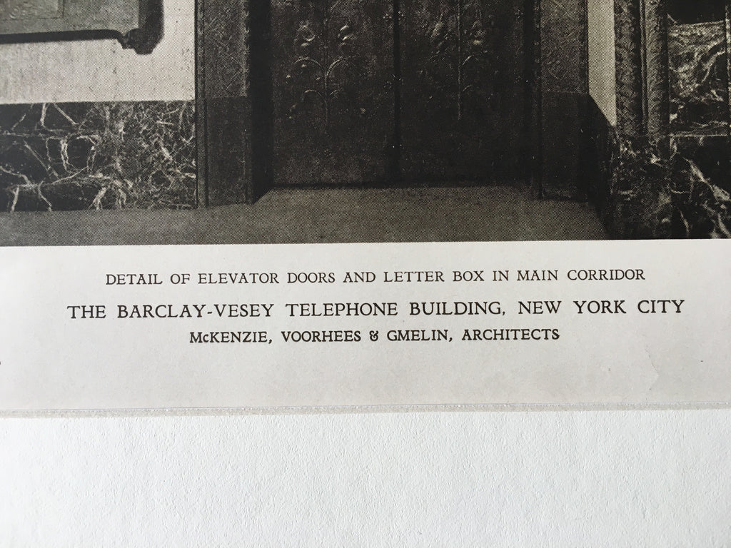 A Beautifully Detailed, Original Lithograph of the Barclay Vesey Telephone Building, New York, NY. Detail of Elevator Doors and Letter Box in Main Corridor. EARLY PHOTOGRAPH. McKenzie, Voorhees & Gmelin, Architect (s.) From the American Architect and Building News, November 20, 1925.