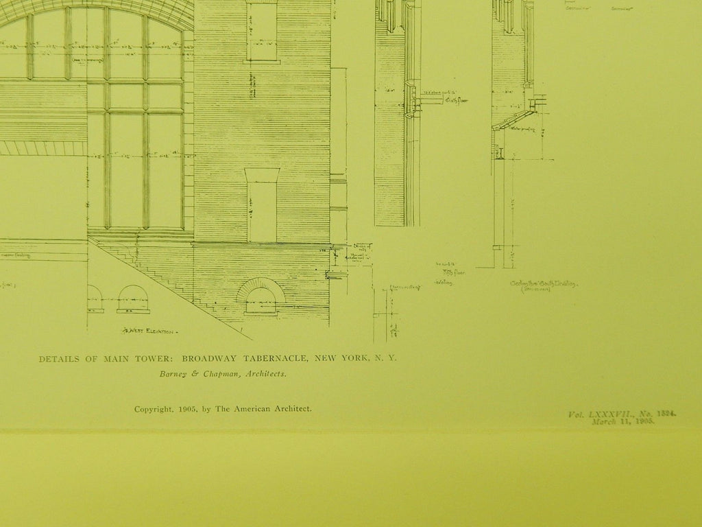 A Beautifully Detailed, Original Plan of the Details of the Main Tower of the Broadway Tabernacle in New York, New York. Barney & Chapman, Architect. From the Building News, March 11, 1905.