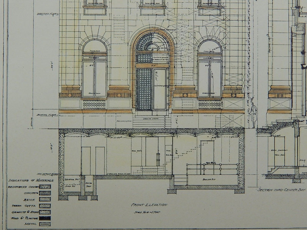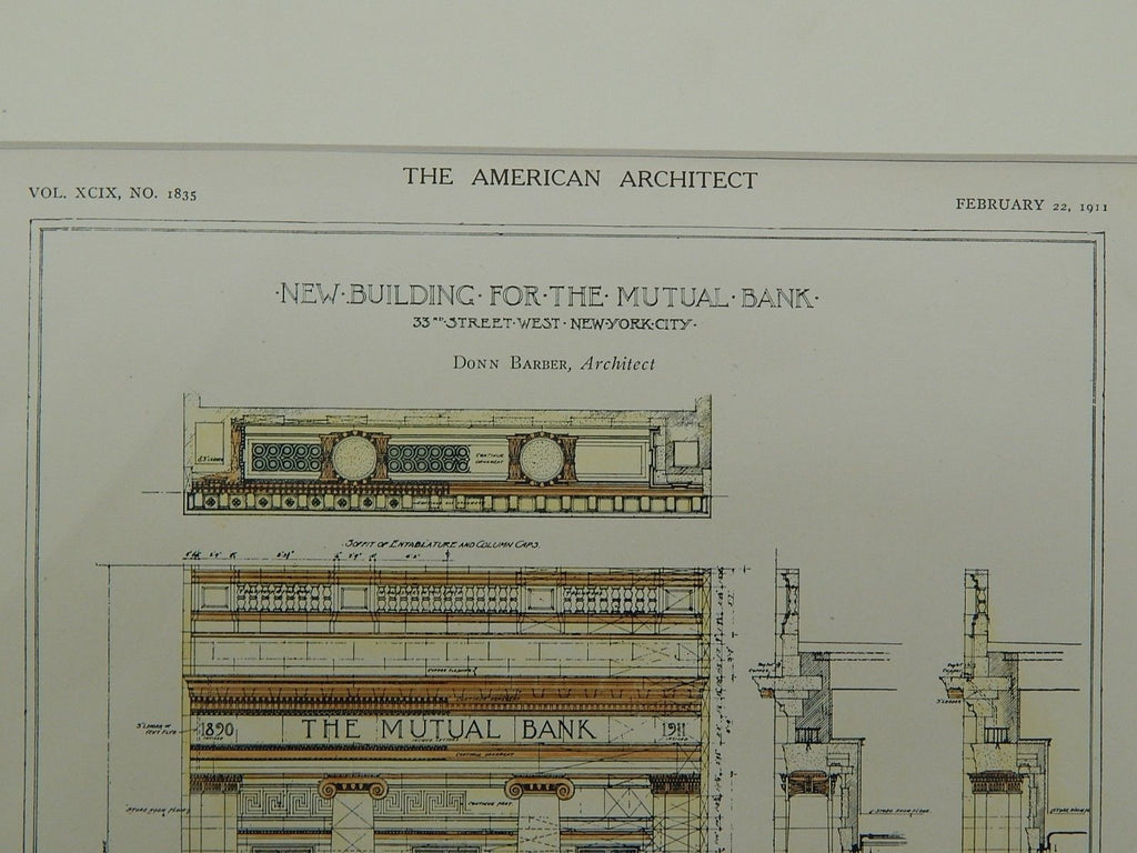A Beautifully Detailed, Original Plan of Details of the New Building for the Mutual Bank in New York, New York. HAND-COLORED. Donn Barber, Architect. From the American Architect and Building News, February 22, 1911.