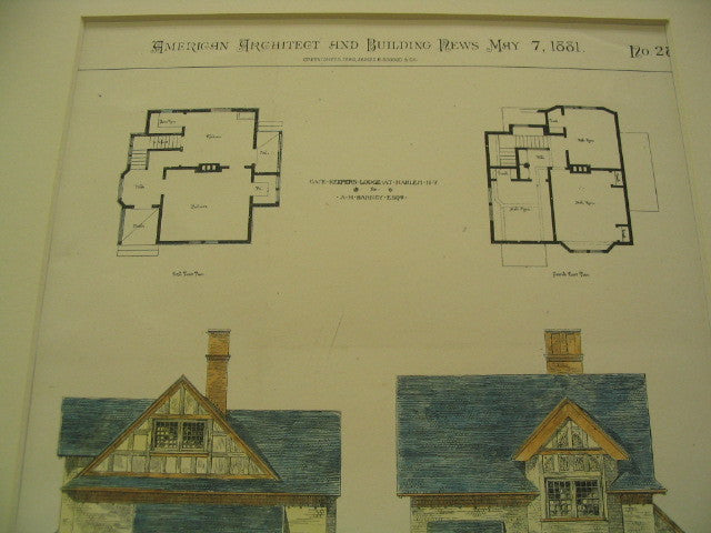 Hand-colored Original Plan. This picture is extremely hard to find, as the American Architect and Building News not only had a very small circulation during that time, but very few were actually preserved or colored as this has been. It measures 12.75 by 8.75 inches. Has a mat border and foam core backing (not attached to the picture). The whole plan measures approximately 16 by 10.5 inches (with mat border). Finely detailed and beautifully hand-colored. Shrink wrapped. Plan is in VG+ condition with light browning along the edges.