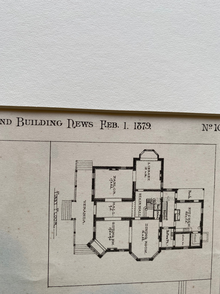 A Beautifully Detailed, Original Plan of the Residence of William B Keys, Glendale, near Cincinnati, Ohio. HAND COLORED W Charles Crapsey, Architect(s). From the American Architect and Building News, February 1, 1879.