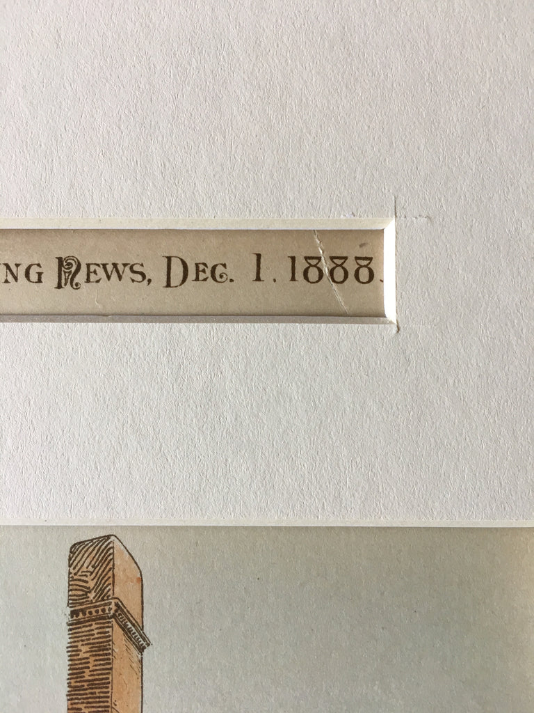 This picture is extremely hard to find, as the American Architect and Building News not only had a very small circulation during that time, but very few were actually preserved or colored as this has been. It measures approximately 7 by 8 inches and has a mat border and foam core backing (not attached to the picture). The whole plan measures approximately 11 by 12 inches (with mat border). Finely detailed and beautifully hand colored. Shrink wrapped.
