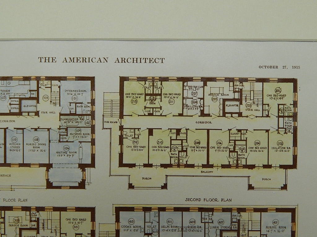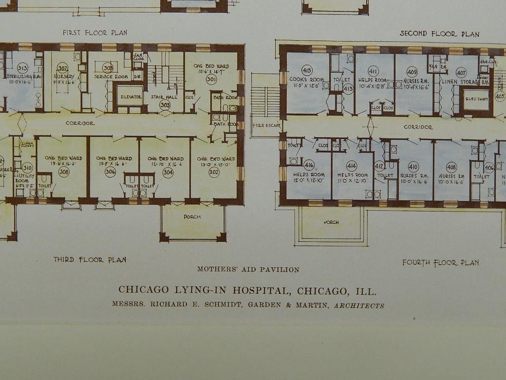 A Beautifully Detailed, Original Plan of Mothers' Aid Pavilion at the Chicago Lying-In Hospital in Cihcago, Illinois. HAND-COLORED. Richard E. Schmidt, Garden & Martin, Architects. From the American Architect and Building News, October 27, 1915.