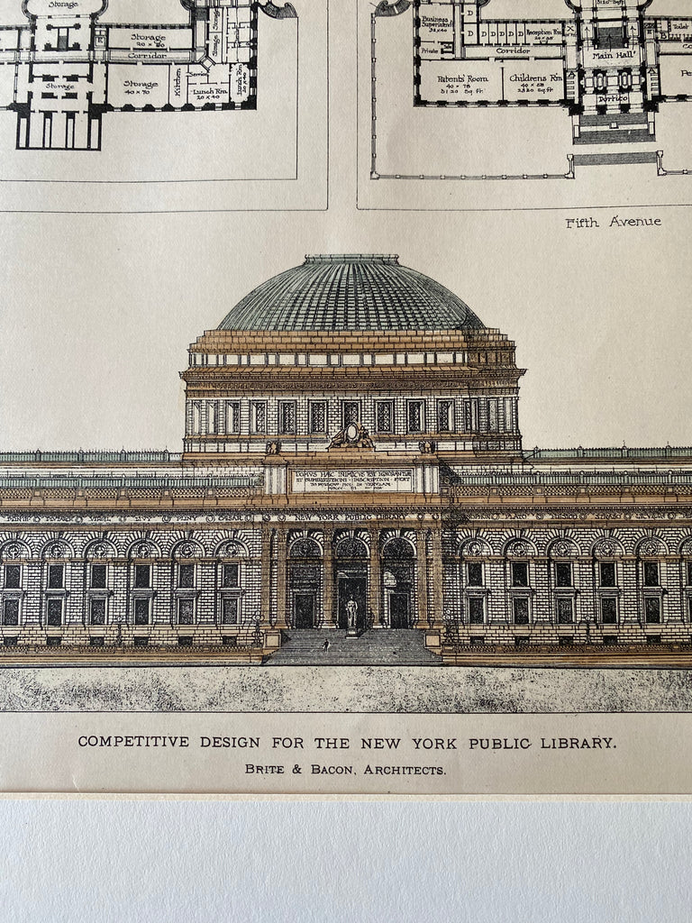 A Beautifully Detailed, Original Plan of the Competitive Design for the New York Public Library, 5th Avenue, New York. Hand Colored Brite & Bacon, Architects. From the American Architect and Building News, October 2, 1897.