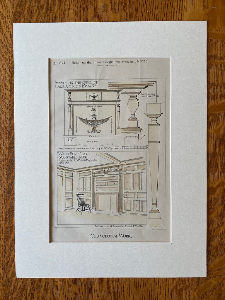 A Beautifully Detailed, Original Plan of the Mantel in the Office of Lamb & Rich on Broadway, NY; Waitt Place at Barnstable, MA. HAND COLORED Measured and Drawn by Frank E Wallis, Architect(s). From the American Architect and Building News, December 4, 1886.